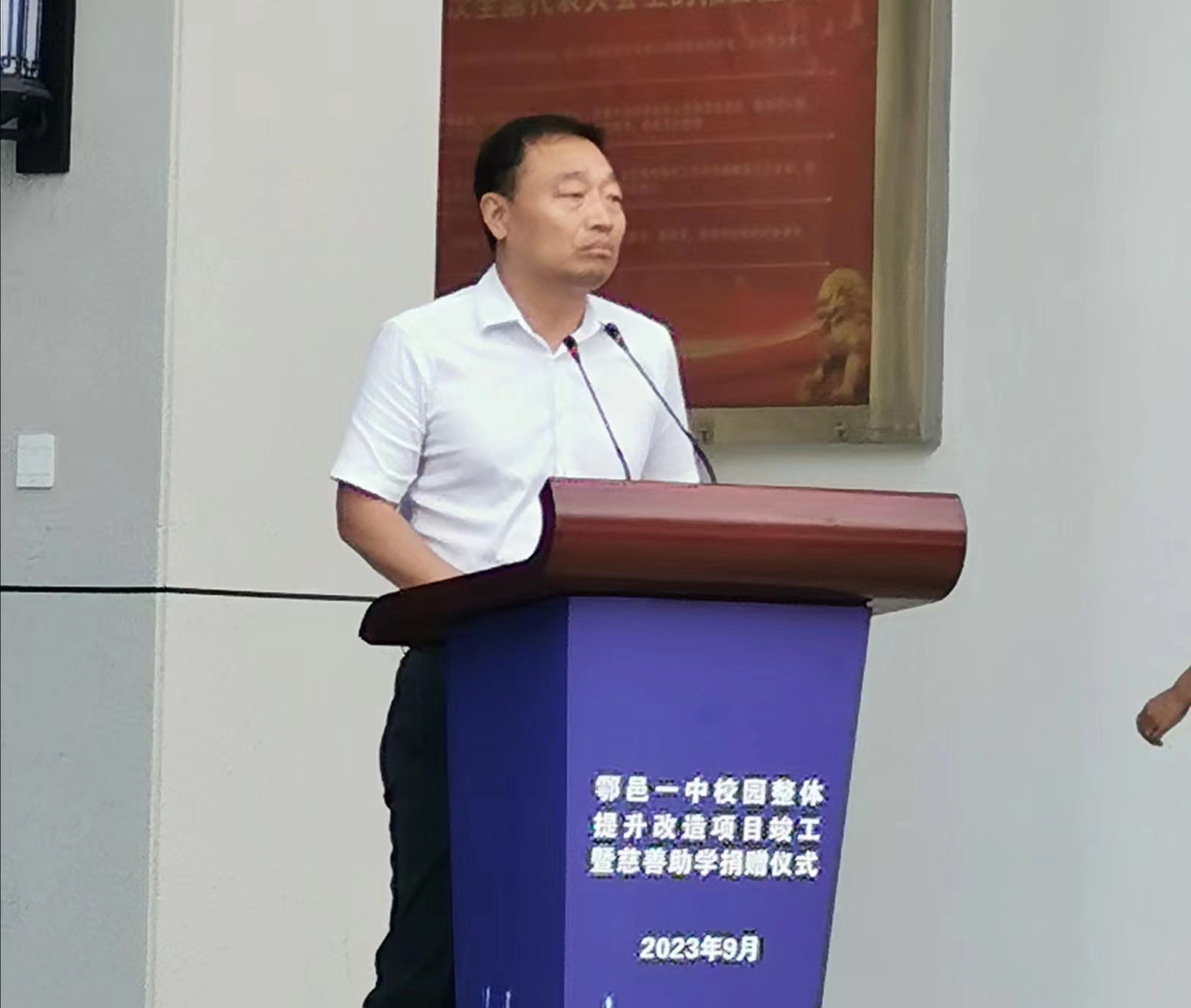区委书记李化,区委副书记、区长汪国栋以及区慈善协会会长杨建敏等领导站起来向捐赠企业鼓掌握手以表谢意。现场气氛热烈掌声雷动,鄠邑一中校长王良民致辞对对区慈善协会和捐赠企业表示衷心的感谢!感谢他们的慈善大爱,对鄠邑区教育事业的鼎力支持。鄠邑一中校长王良民介绍了教学楼改造、校园整体改造竣工以及教学工作情况。区委书记李化强调慈善助学、教育发展需要社会方方面面的支持。一中校园整体改造提升工程从7月9日启动。建设方立下了军令状,今天的改造倾注了大家的共同努力和连续作战、不怕疲劳的精神的大量心血。他强调:办好人民满意的教育,必须按照党管教育的原则,尊重教育教学的规律,让每一个孩子都能有学上,接受良好的教育,为社会培养社会主义合格人才。他祝企业家们身体健康!祝全体师生教师节即将到来之际,大家身体健康,万事如意。