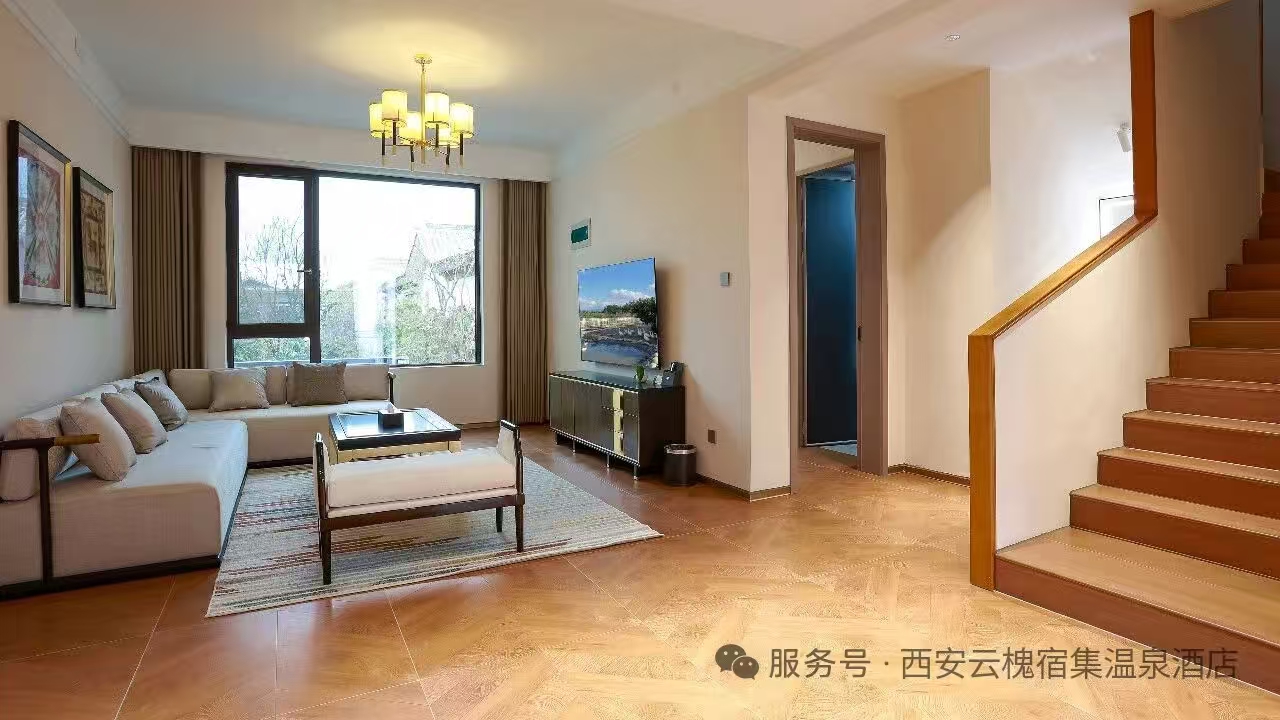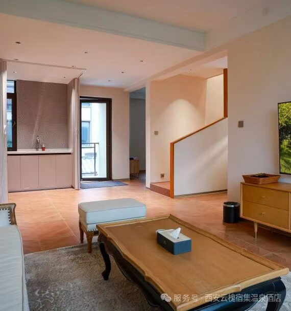 专为家庭度假和小团体出行设计的温泉汤院,是云槐的“宝藏房型”。70㎡套内面积搭配40㎡私家庭院,2 室2厅1厨2卫+独立温泉汤池的配置,让“私汤入户、阖家欢享”成为现实。
