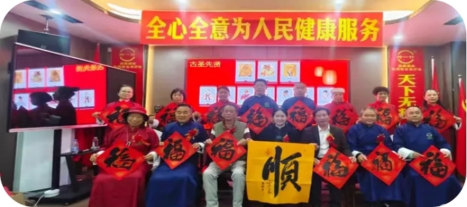 活动现场花絮如春水映花、流光溢彩:弟子们演示“子午流注”针法时指尖生风,顾问团现场解析“节气食养”方案时妙语连珠,茶歇区手作艾草香囊的欢声笑语萦绕不绝…活动最后大家在公司前台合影:高举福字推广幸福健康,讲师团优秀卓越的讲师王强手持大顺字恭祝大家:一顺百顺万事顺…传统与现代交织,专业与温情交融,一场有高度、有温度、有厚度的健康文化盛宴,在辞旧迎新之际,悄然播下全民健康素养提升的希望种子。