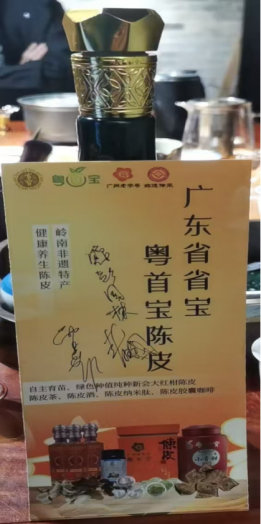 活动现场,非遗大师赵卫国向雷安娜女士赠送了粤首宝非遗陈皮酒系列之“东方美人酒”,以非遗匠心致敬艺术创作。赵卫国还向她介绍了新会陈皮酒的非遗传承历史与传统酿造技艺,讲述了陈皮酒作为岭南特色非遗产品的文化价值与健康理念。雷安娜女士对这份充满广府文化底蕴的礼物表示由衷感谢,并现场签名留念,双方就非遗文化保护、艺术创作与公益慈善的融合发展进行了亲切交流。