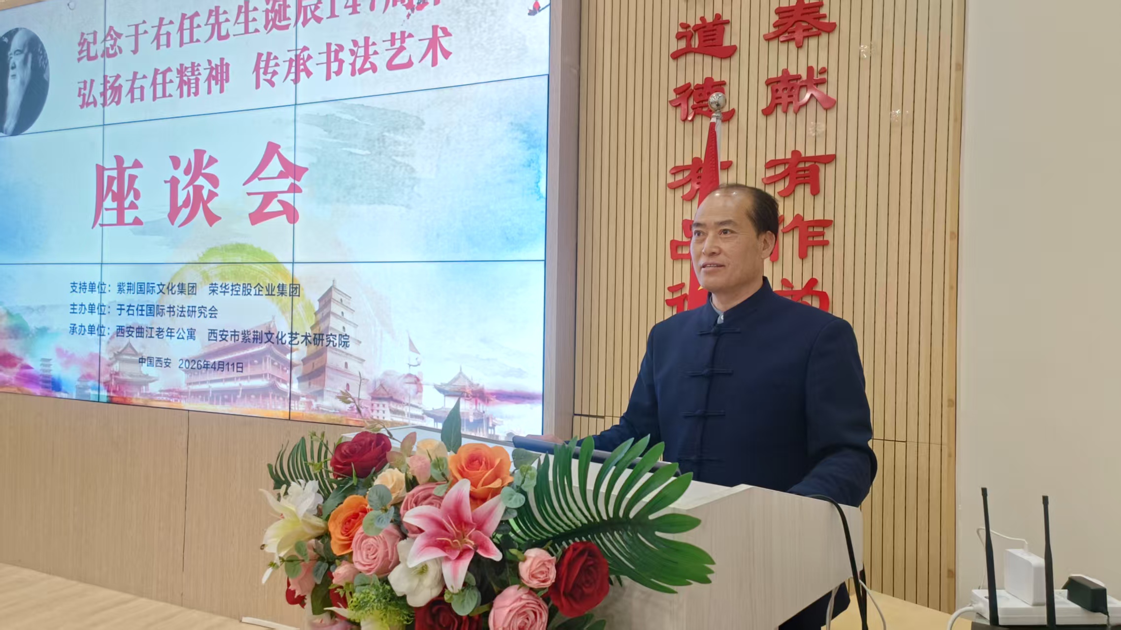 央媒时代西安讯(记者 沈海刚) 4月11日,以“弘扬右任精神,传承书法艺术”为主题的纪念于右任先生诞辰147周年座谈会在西安隆重召开。本次活动由于右任国际书法研究会主办,西安曲江老年公寓、西安市紫荆书画艺术研究院承办,紫荆国际文化集团、荣华控股企业集团鼎力支持,文化界、书法界、学术界专家学者及各界代表齐聚一堂,共同缅怀辛亥革命先驱、一代草圣、伟大爱国者于右任先生,深入研讨其精神内核与艺术成就,共话中华优秀传统文化传承发展。