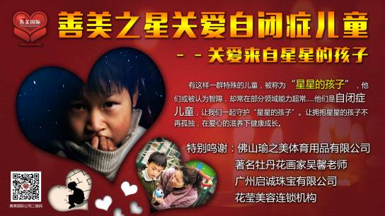 善美之星爱心温暖地球之 关爱自闭症 儿童 根据2007年第二次全国抽样调查显示,中国0-6岁的儿童孤独症患病率为千分之1-2,自闭症儿童,为先天性疾病,主要表现为不同程度的言语发育障碍、人际交往障碍、兴趣狭窄和行为方式刻板。约有3/4的患者伴有明显的精神发育迟滞,部分患儿在一般性智力落后。善美之星关爱星星的孩子活动 参与捐助的企业有佛山善美科技、广州启诚珠宝瑜之美体育用品、著名画家吴卿女士、善款将会用于高明启慧特殊教育学校训练室建设 以及活动中心设备用品完善,给星星孩子们一个更有质量的训练环节。