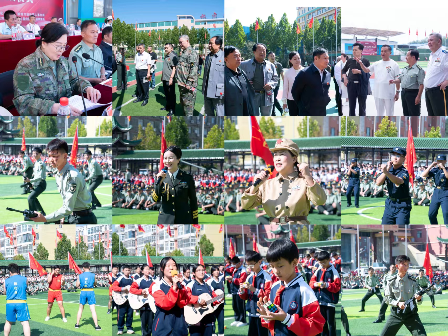 分列式后,上演了精彩的素质教育成果展示。高中部舞狮队灵动矫健,传递勇敢团结的精神;大连人民广播电台原主持人李雪与小学部学生共同演绎歌配颂《英雄赞歌》,深情致敬革命先烈;小学部的魔方表演展现智慧与速度,初中部带来的吉他弹唱《巡光》诉说青春理想;高中部的搏击操《拳台少年志》将力量与韵律融合,展现了军校学子的蓬勃朝气、自信昂扬与坚韧不拔的精神风貌;教导大队与高一年级学生共同演绎的军事科目综合展示则尽显我校国防教育成效。