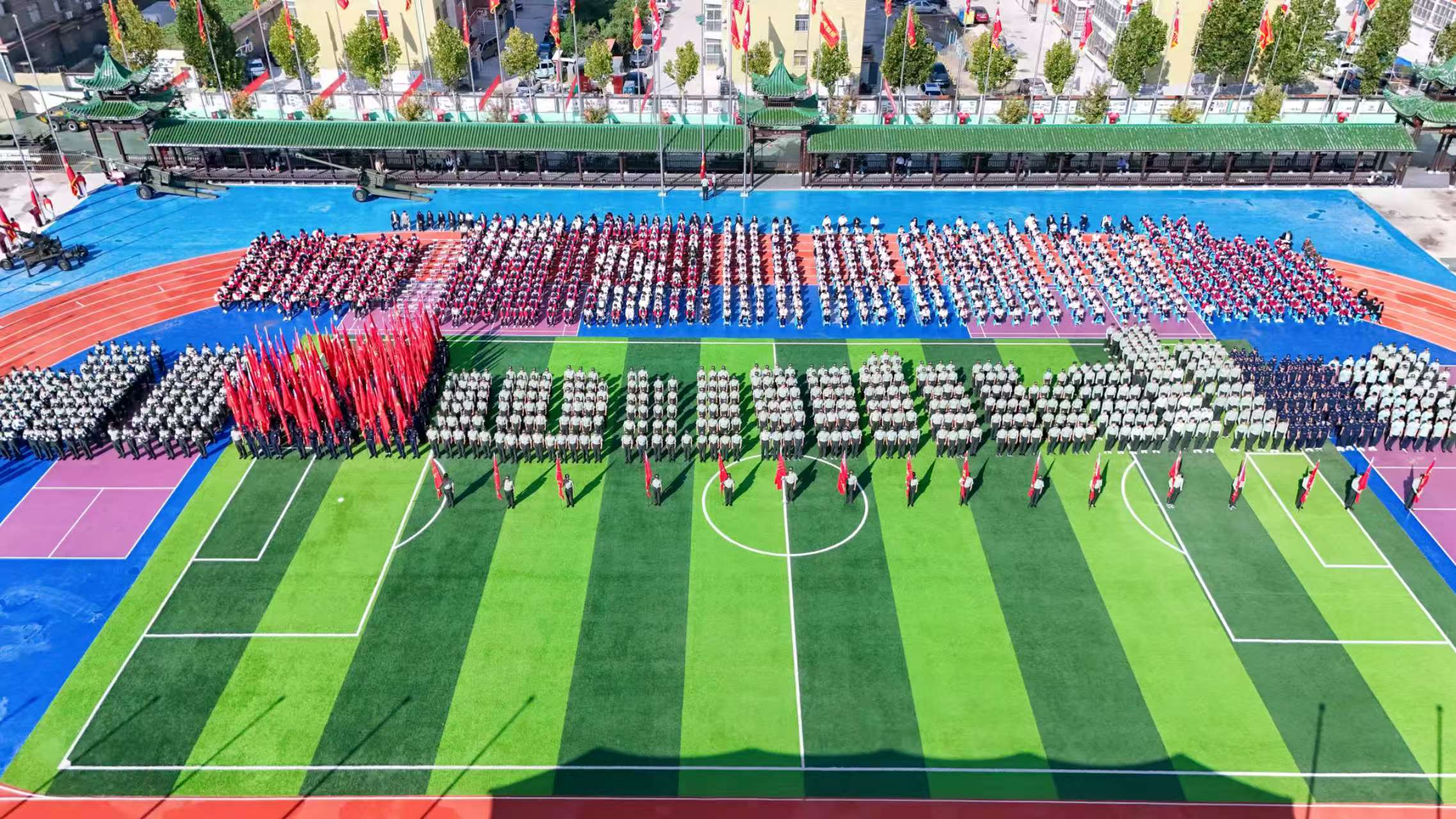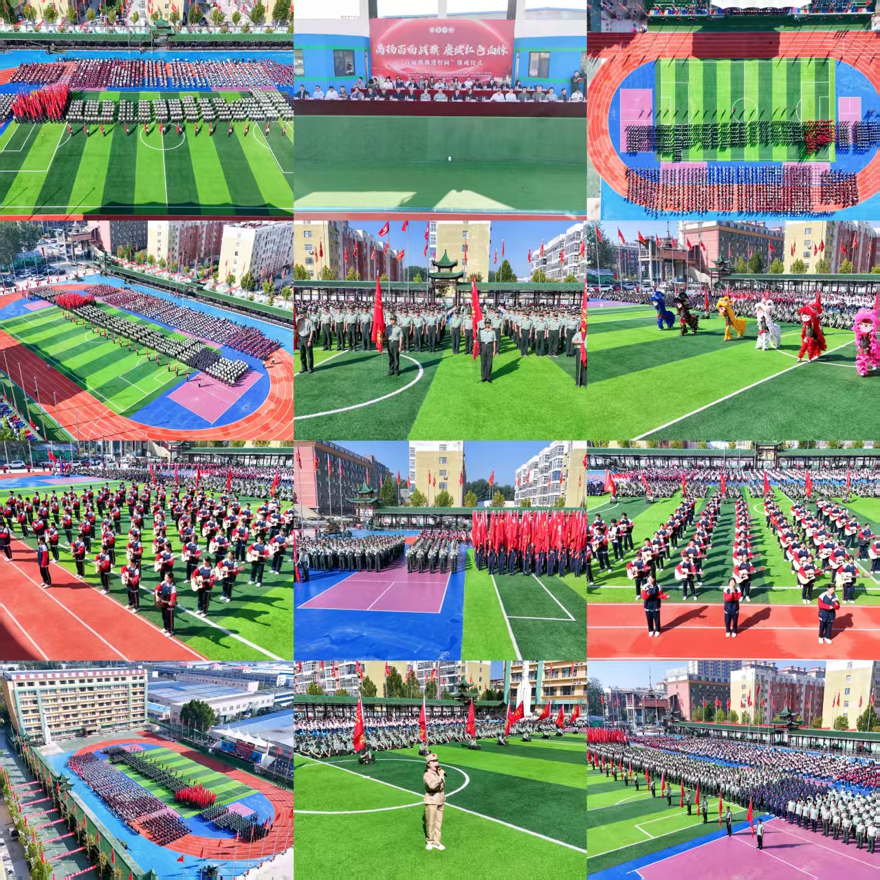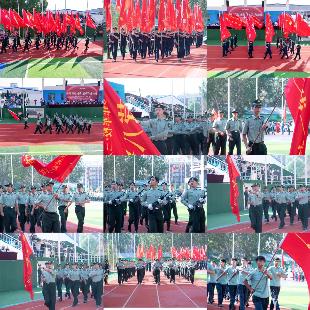 仪式现场,国旗护卫队步伐铿锵,诠释 “护卫国旗,重于生命” 的誓言;步枪方队身姿挺拔,展现少年学子的英武气概;百面战旗方队缓缓前行,每一面旗帜都牵引着对英雄的追思;高中部各营连队、教师方队依次通过检阅台,展现出军校严明的纪律作风与昂扬的精神面貌。