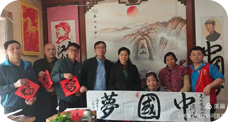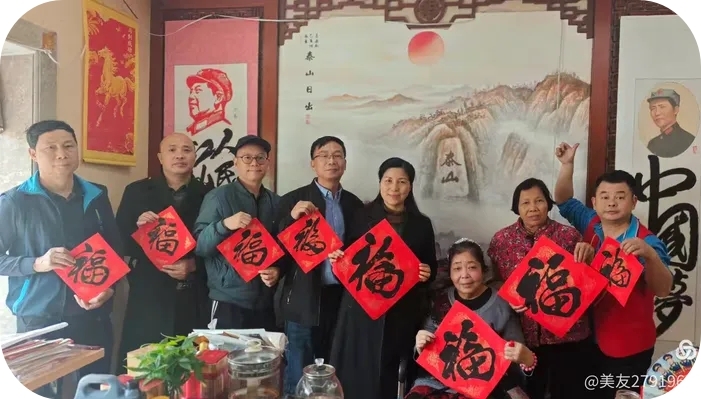 王琎老师现场挥毫“福”字,朱砂点染、红纸映辉,福气盈门、福泽万家。他特邀陈建军大姐与全体同仁合影留念,以“福文化”为媒,将红色基因的厚重、家国情怀的深沉、商业向善的温度有机熔铸——丙午马年,福启新程;惠成所至,福满人间;红色所系,福润千行!