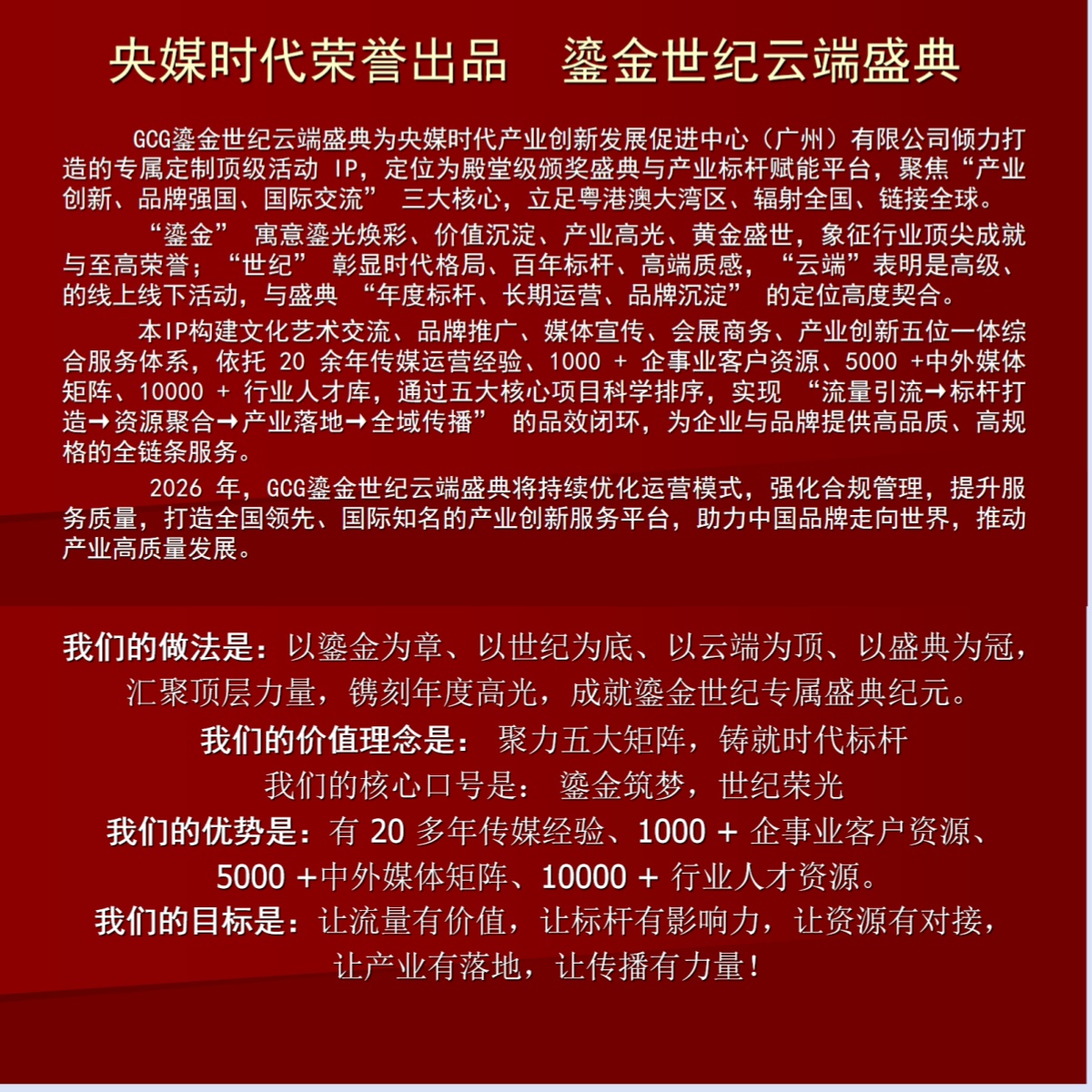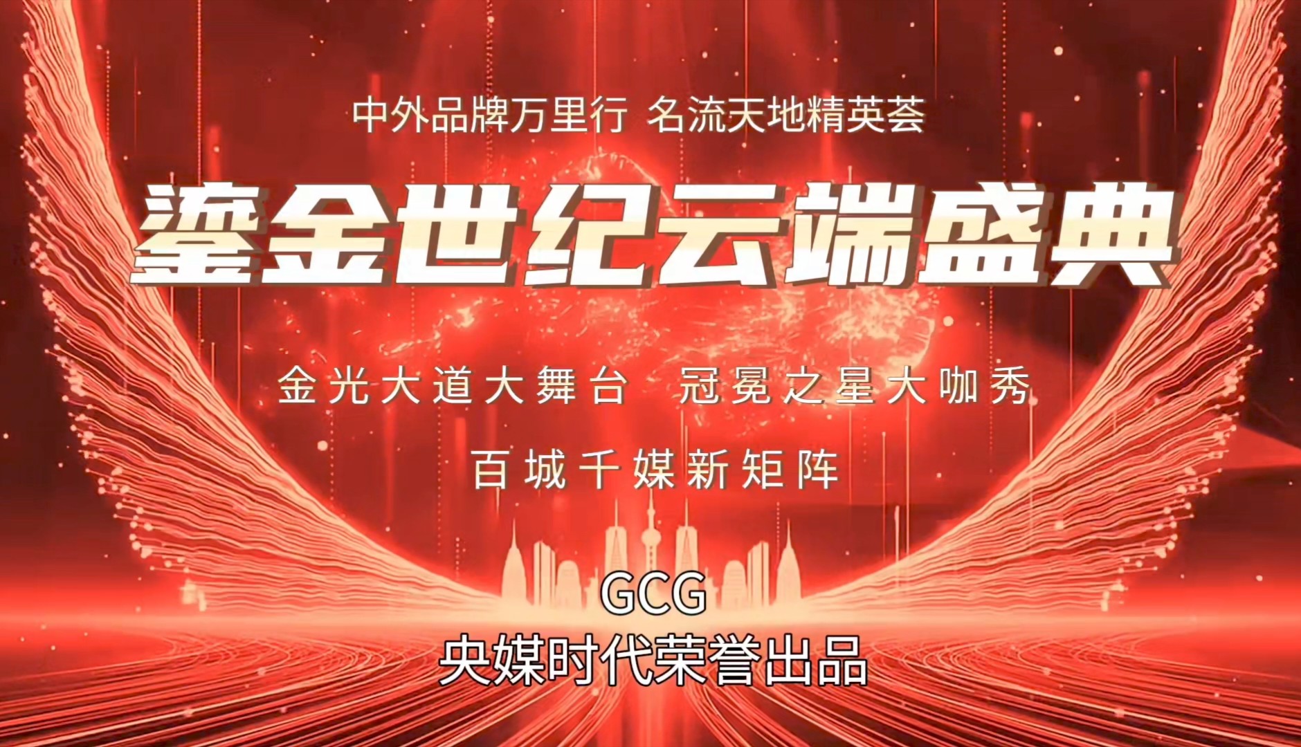 GCG鎏金世纪云端盛典(简称:GCG鎏金盛典),是由GCG央媒时代荣誉出品、央媒时代产业创新发展促进中心(广州)有限公司倾力打造、与广东现代城市产业技术研究院、广东艺术促进会、幸福广东主题系列活动组委会联合主办的高端品牌盛典IP,盛典覆盖品牌、文化、艺术、科技、金融、文旅等多领域,采用“云端盛会+线下盛典”双模式,打破地域限制,实现全球同步参与、全网实时传播,为企业形象与个人形象提供全方位推广与多角度曝光机会,打造“政-商-文-媒”跨界合作平台。盛典的主题口号是:鎏金启盛世,云端谱华章。核心理念是赋能品牌、链接资源、弘扬文化。核心价值是打造集品牌展示、文化展演、资源对接、标杆加冕、全域传播于一体的高端跨界平台,助力企业品牌升维、产业创新升级与中外互联互通。