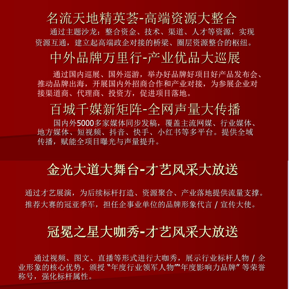 盛典以“金光大道大舞台、冠冕之星大咖秀、百城千媒新矩阵”为核心框架,联动五大核心项目,形成“流量引流→标杆打造→资源聚合→产业落地→全域传播”的品效闭环——1.金光大道大舞台·才艺风采大放送 打造沉浸式展演秀场,融合文化艺术与品牌表达,甄选优质才艺IP,为品牌与个人提供高光展示窗口,实现流量精准引流。2.冠冕之星大咖秀·标杆形象大亮相 聚焦行业标杆、精英领袖与品牌典范,通过高规格颁奖、形象定制与荣耀加冕,打造“冠冕之星”IP,树立行业标杆、提升品牌影响力。3.名流天地精英荟·高端资源大整合 汇聚政商学界领袖、行业精英与高净值人群,以主题沙龙、高端论坛、私享对接会为载体,构建跨界资源生态圈,实现精准资源链接与合作落地。4.中外品牌万里行·产业优品大巡展 立足中外产业前沿,开展品牌巡展、项目路演与优品品鉴,推动中国品牌出海、国际资源引入,助力产业互联互通与创新落地。5.百城千媒新矩阵·全网声量大传播 联动央媒、地方主流媒体、新媒体与海外传播渠道,构建全域传播矩阵,实现盛典与合作品牌的高曝光、广覆盖、强声量。